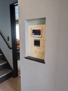 元々玄関ドアが電気式なので天井裏まで来てる配線をなんとか床下まで送り通してリビングとホールのニッチに取り付ける作業をやらせていただきました!